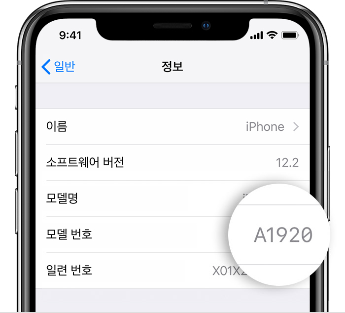 설정 > 일반 > 정보로 이동합니다. 모델 오른쪽에 부품 번호가 나와 있습니다. 모델 번호를 보려면 부품 번호를 탭합니다.