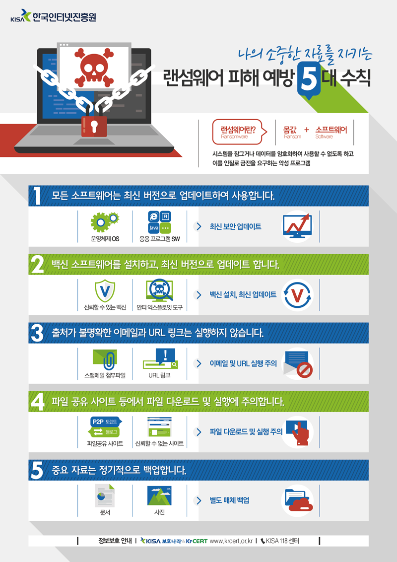 랜섬웨어 5대 예방수칙을 한국인터넷진흥원에서 친절하게 알려주고 있다.