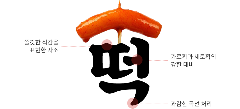 밀가루 떡볶이 특유의 말랑말랑한 이미지를 모티브로 정사각형 그리드에 맞춰진 명조형태의 서체로, 서체에서 국대떡볶이가 연상될 수 있도록 캐릭터를 부여하였습니다.