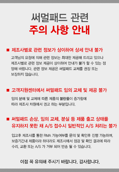 3. 써멀패드 손상, 임의 교체, 분실 등 제품 출고 상태를 유지하지 못한 채 A/S 접수시 일반적인 A/S 처리는 불가
