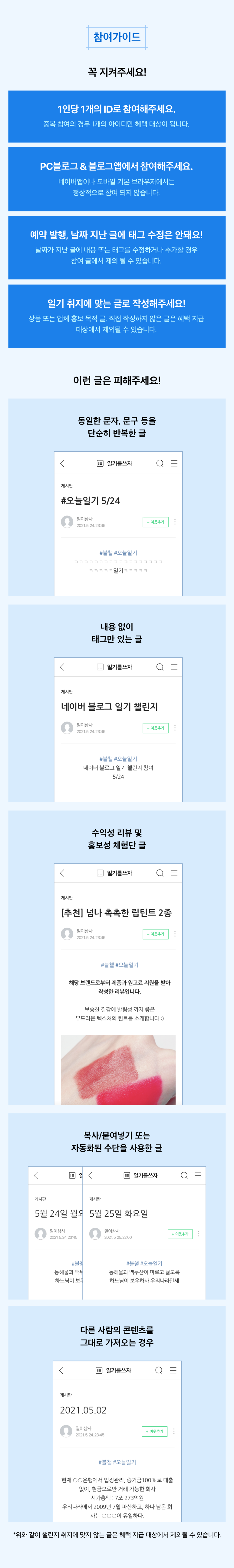- #오늘일기 챌린지 관련 이벤트 도움말을 참고하시고, 문의사항은 네이버 블로그 고객센터를 통해 문의 부탁 드립니다.