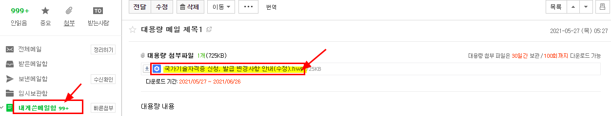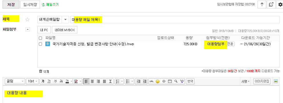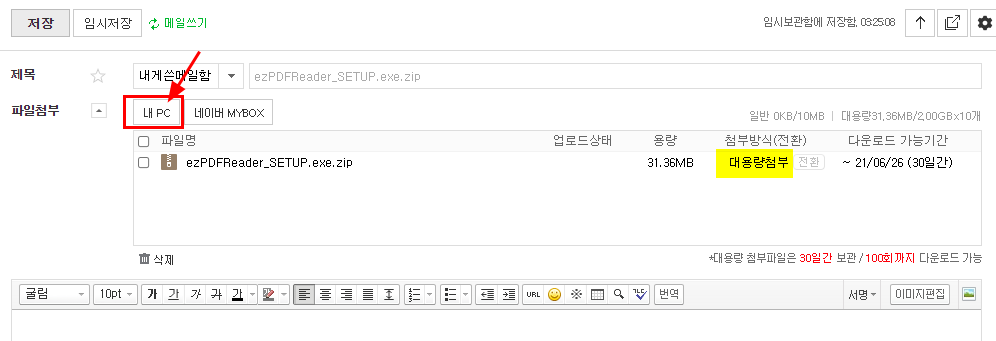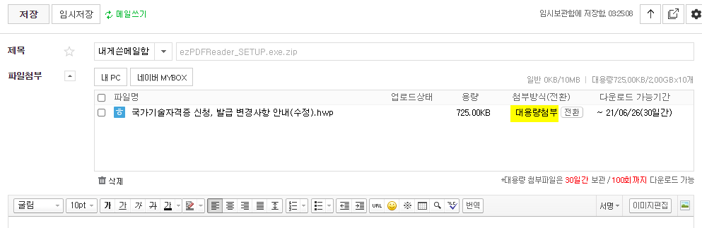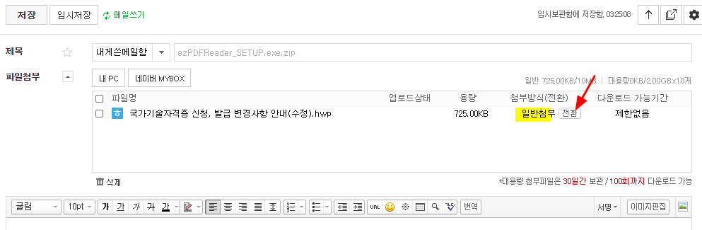 다시 말하지만 첨부방식은 '대용량첨부'로 되어 있어야 된다. 일반첨부면 [전환]글자를 클릭해서 대용량첨부로 바꿔주면 된다.