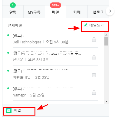 2. 네이버 로그인 후, 메일 쓰기나 하단의 메일을 클릭해서 네이버 메일 화면으로 들어가자.
