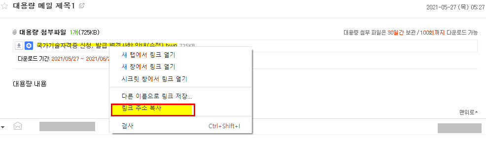 10. 첨부파일명 위에 오른쪽 마우스 클릭을 해서 [링크 주소 복사]를 선택한다.