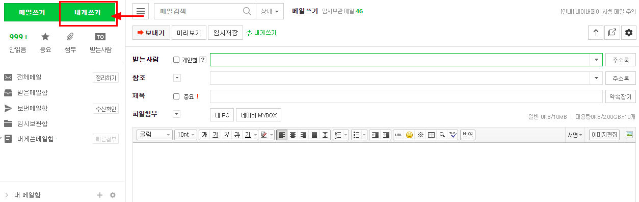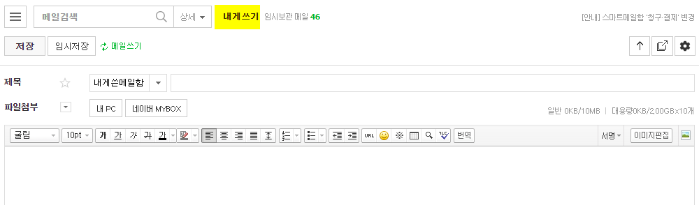 4. 내게 쓰기로 클릭했다면 아래와 같이 받는 사람 주소, 참조 주소를 입력하는 부분이 없을 것이다.