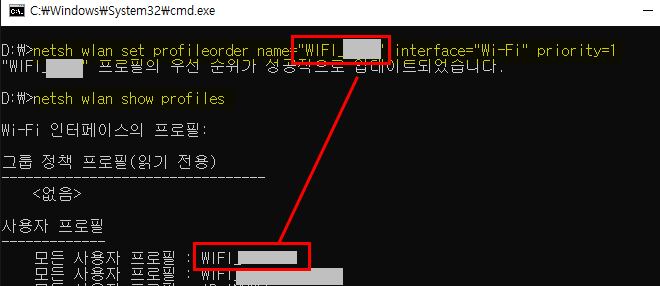 netsh wlan set profileorder name ="와이파이신호명" interface="Wi-Fi" priority=1 이렇게하고 엔터