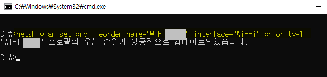 netsh wlan set profileorder name ="와이파이신호명" interface="Wi-Fi" priority=1 이렇게하고 엔터