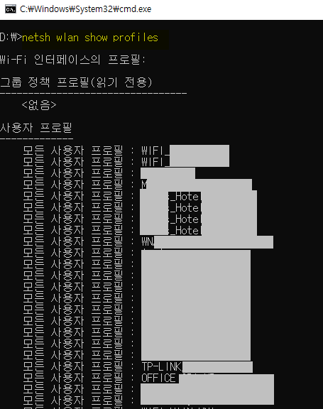 netsh wlan show profiles 라고 입력하고 엔터키를 누른다. 전체 소문자로 써야 한다.