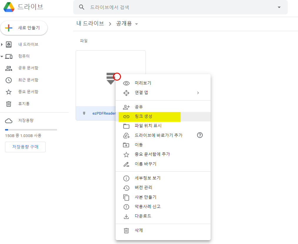 해당 파일 위에 오른쪽 마우스 클릭하면 [링크 생성] 을 클릭한다.