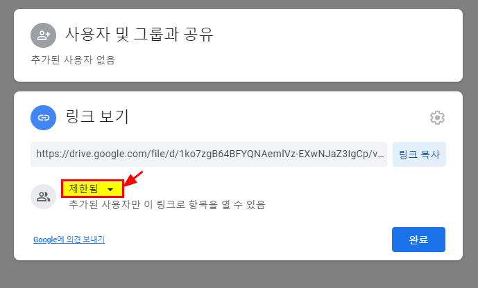 간단하게 링크주소만 알려주고 다운받으려고 하면, 아래 [제한됨] 을 선택해서 '링크가 있는 모든 사용자에게 공개'로 변경만 해 주면 된다.