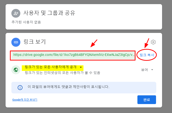 12. 그러면 이런식으로 링크가 있는 모든 사용자에게 공개 = 링크가 있는 인터넷상의 모든 사용자가 볼 수 있음 으로 나오며 해당 링크 주소를 복사해서 알려주면 된다.