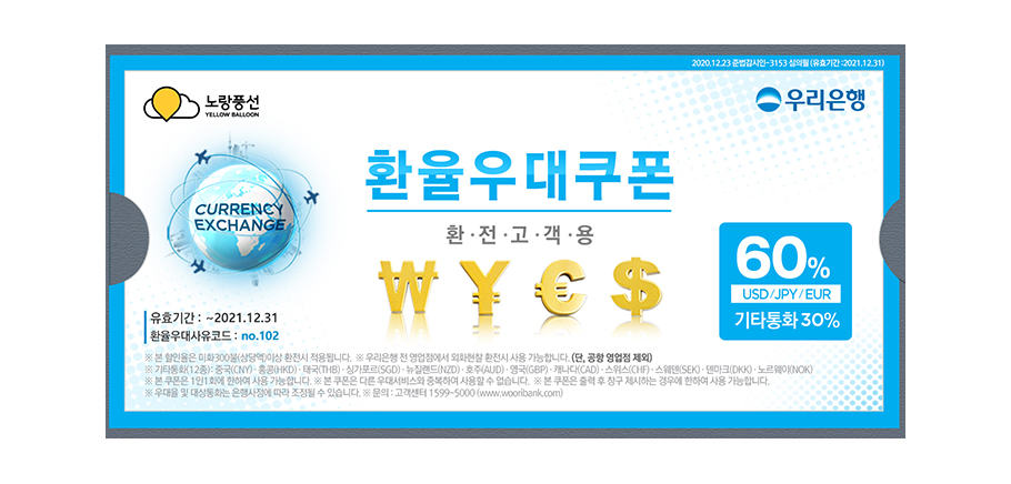 본 쿠폰을 제시하면 주요통화(USD, JPY, EUR)로 환전 시 60%의 수수료 우대 혜택을 받을 수 있습니다.