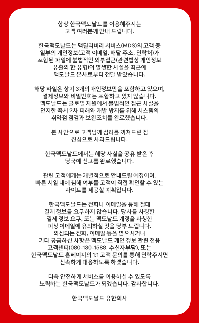 한국맥도날드는 맥딜리버리 서비스(MDS)의 고객 중 일부의 개인정보(고객 이메일, 배달 주소, 연락처)가 포함된 파일에 불법적인 외부접근(관련법상 개인정보 유출의 한 유형)이 발생한 사실을 최근에 맥도날드 본사로부터 전달 받았습니다.