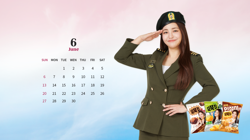 오리온에서 호국보훈의 달인 6월에도 사랑스러운 꼬북좌, 브레이브걸스 유정의 배경화면을 공개하였다.