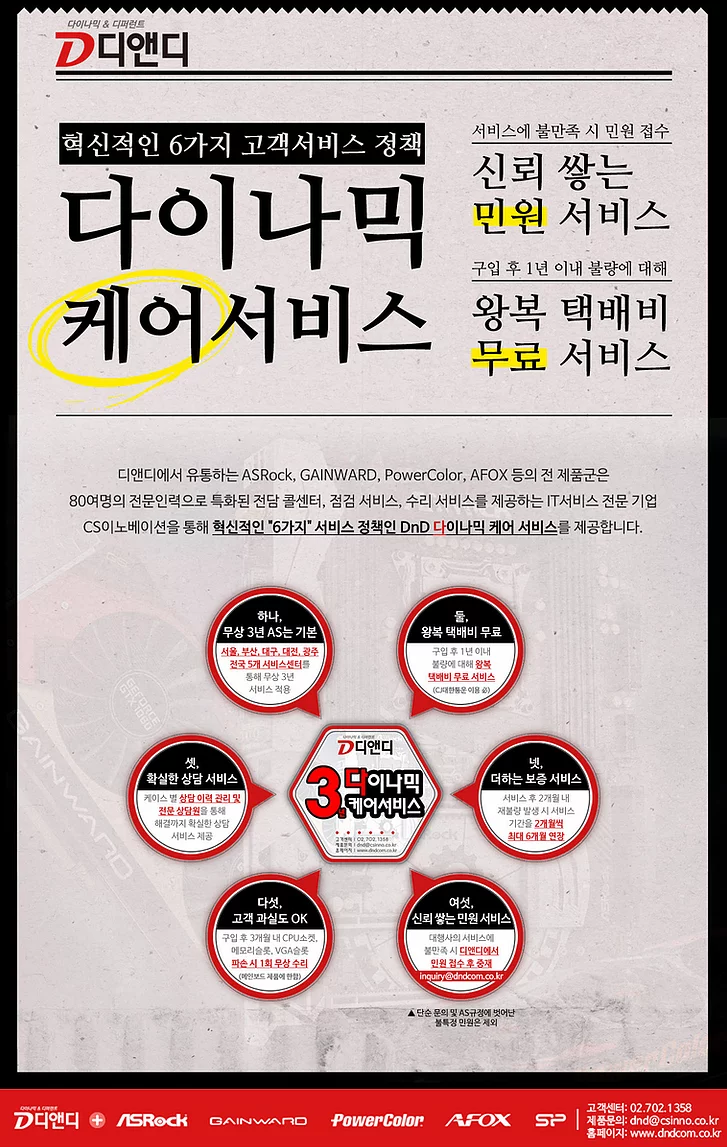 디앤디컴에서 유통하는 ASRock, GAINWARD, AFOX 등의 전 제품군은 80여명의 전문인력으로 특화된 전담 콜센터, 점검 서비스, 수리 서비스를 제공하는 IT서비스 전문 기업 CS이노베이션을 통해 혁신적인 "6가지" 서비스 정책인 DnD 다이나믹 케어 서비스를 제공합니다.
