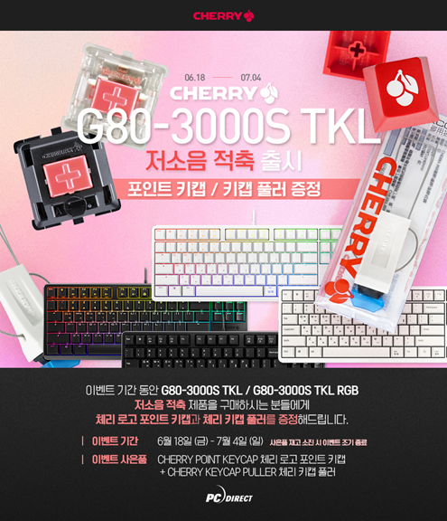 피씨디렉트에서 체리의 텐키리스 키보드 G80-3000S TKL (RGB모델 포함) 기계식 키보드의 저소음 적축 라인업 확장 기념으로 푸짐한 사은품을 증정하는 이벤트를 실시한다고 밝혔다.