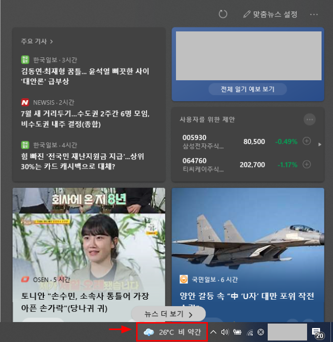 1. 마우스 커서를 작업 표시줄의 날씨 나오는 부분에 대면, 아래와 같이 뉴스 및 날씨 정보가 나올 것이다.