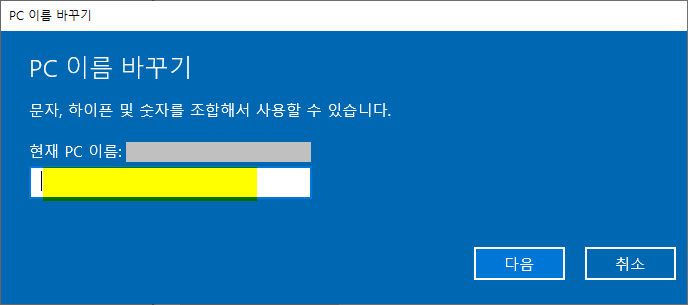 변경할 PC이름을 적당히 입력을 해 줍니다. 한글은 안 됩니다.