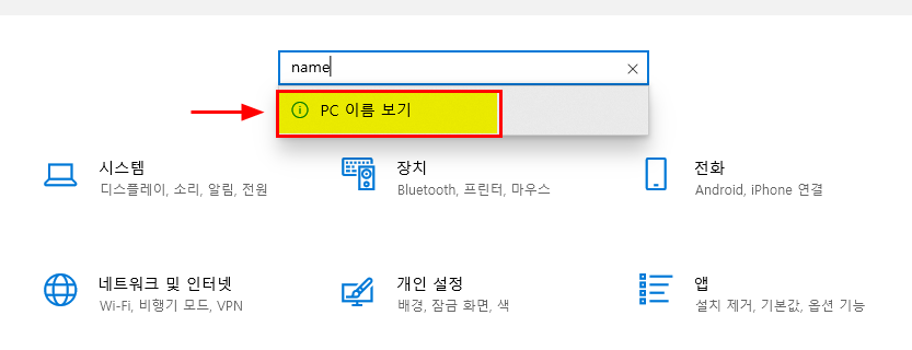 2. 설정창이 뜨면 검색어 'name' 또는 '이름'을 입력하면 아래에 PC 이름 보기 가 나온다.