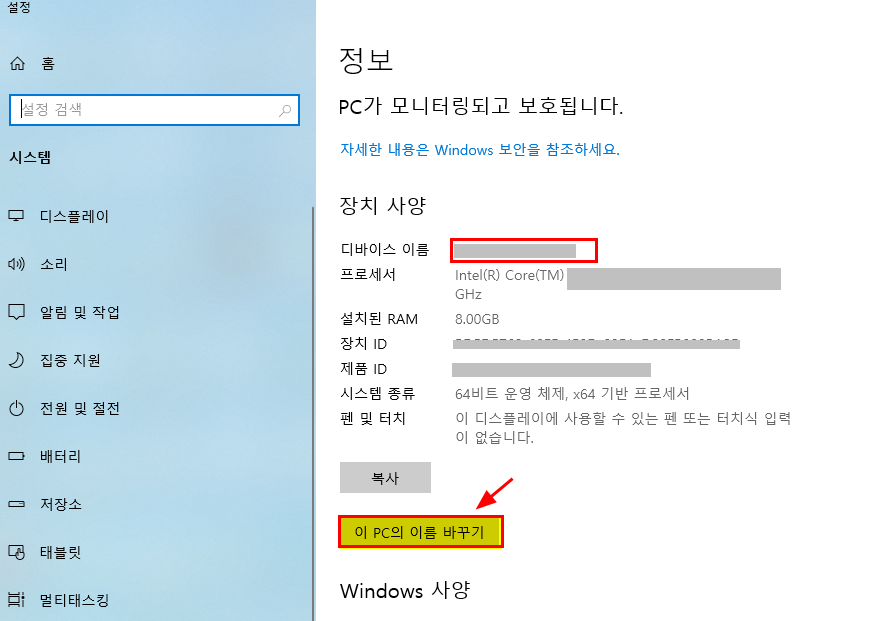 아래쪽에 [이 PC의 이름 바꾸기]를 클릭합니다.