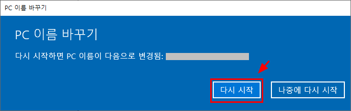 5. 그러면 PC를 다시 시작해야 된다고 나옵니다. [다시 시작] 눌러서 다시 시작한 뒤 보면 PC 이름이 변경되어 있을 겁니다.