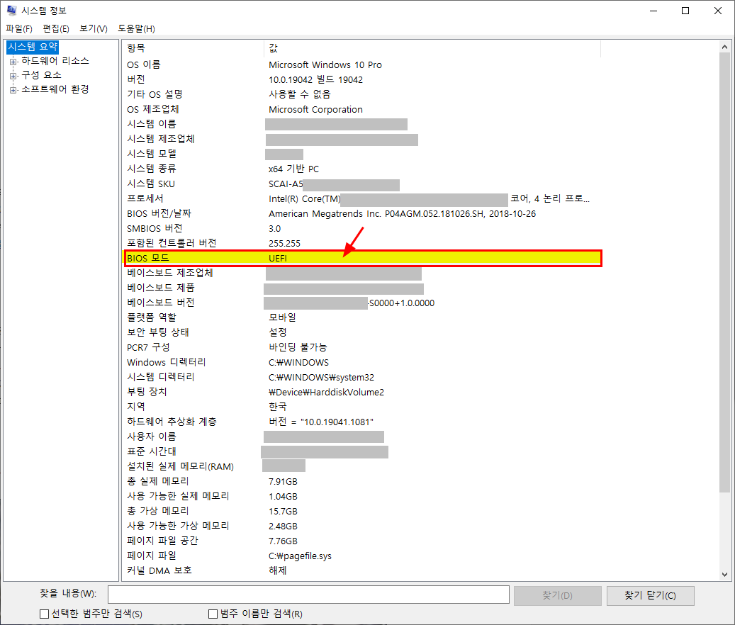 여러 항목 중에 BIOS 모드 쪽 확인을 하면 이렇게 UEFI 라고 적혀 있다.