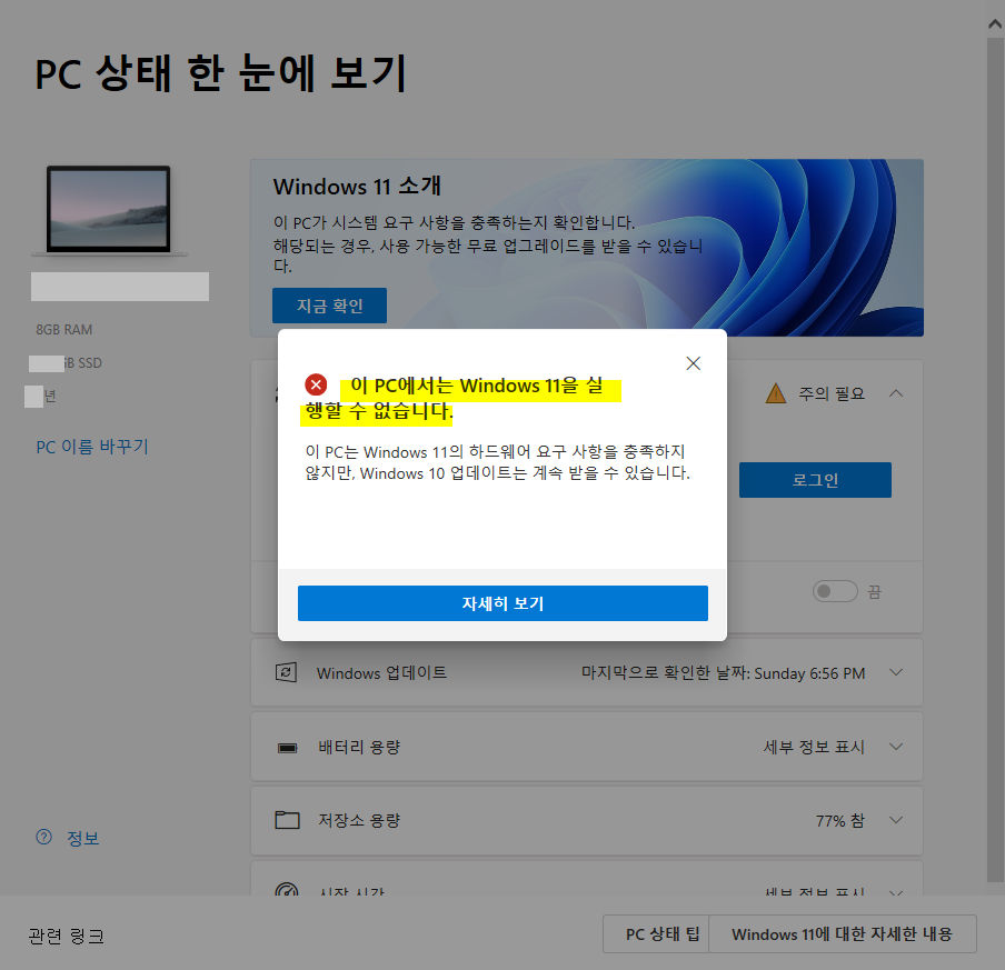 이 PC는 윈도우11의 하드웨어 요구사항을 충족하지 않지만, 윈도우10 업데이트는 계속 받을 수 있습니다.