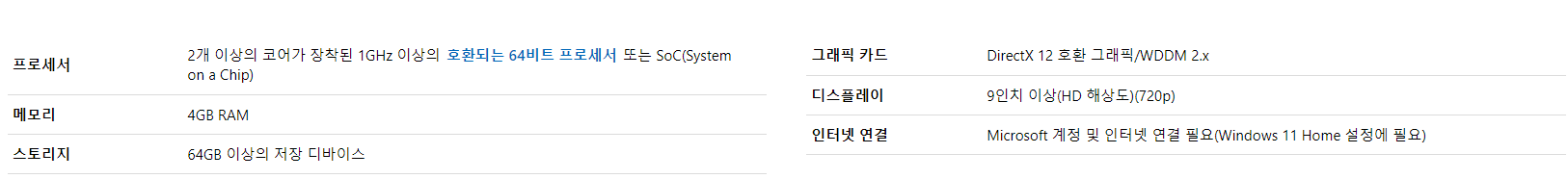 윈도우11의 최소사양은 아래와 같단다.