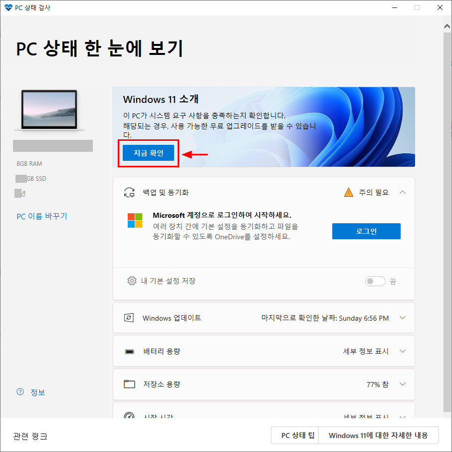 5. PC 상태 검사창이 뜨면 윈도우 11 소개 아래쪽에 [지금 확인]을 클릭하자.