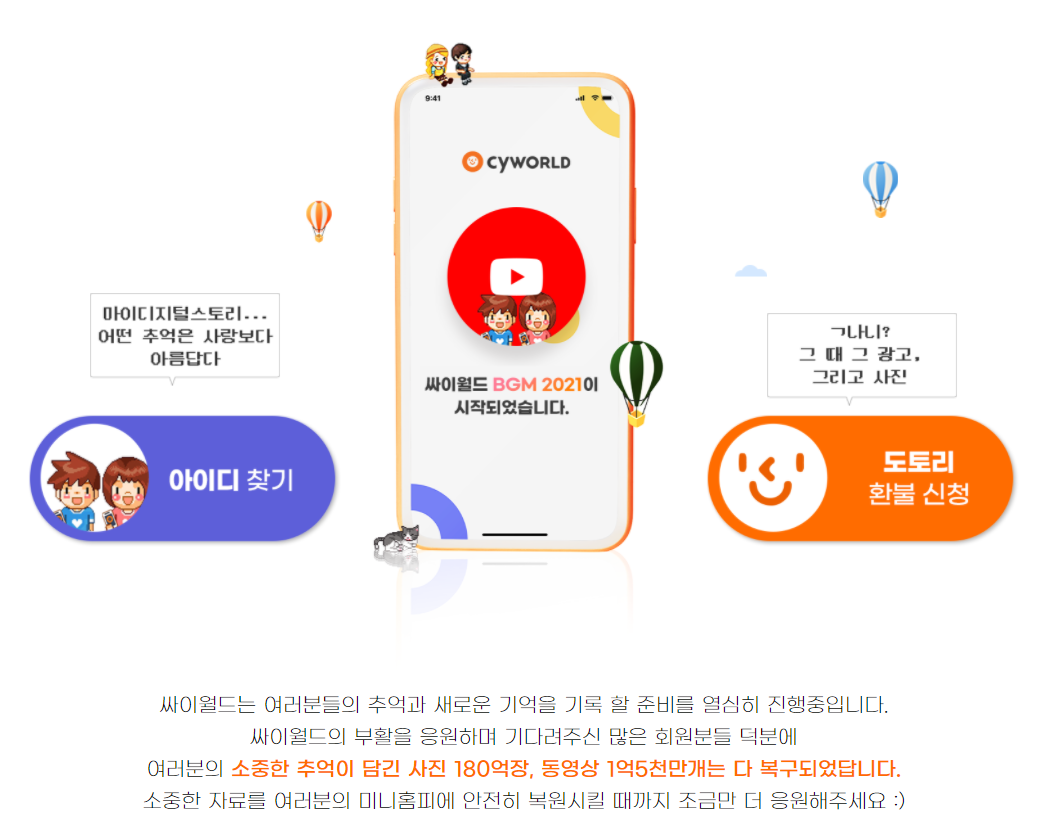 현재 싸이월드의 홈페이지에는 180억장의 사진, 1억5천만개의 동영상이 복구가 되었다고 한다.
