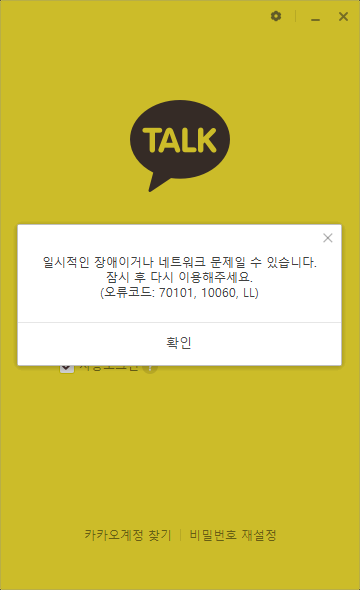 스마트폰 카카오톡은 잘 되는데 pc 카카오톡은 로그인 또는 사용시 아래와 같은 오류메세지가 나올 경우가 있다.