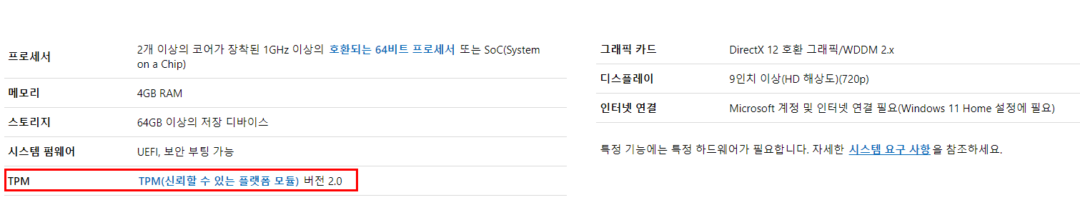 TPM이 무엇인지? 아무튼 윈도우11의 현재 설치 요구사항 중 하드웨어 스펙은 다소 높은 것을 요구하고 있다.