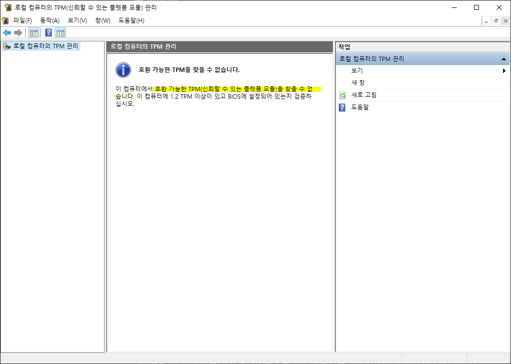 '이 컴퓨터에서 호환 가능한 TPM(신뢰할 수 있느 플랫폼 모듈)을 찾을 수 없습니다. 이 컴퓨터에 1.2 TPM 이상이 있고 BIOS에 설정되어 있는지 검증하십시오.'
