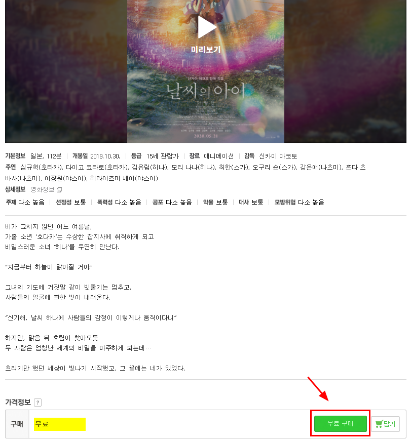 여러 무료영화가 있지만, 그중에서 일본 애니메이션 '날씨의 아이'을 무료로 다운 받을 수 있다.