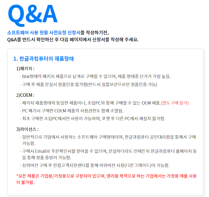 - 3) 패키지 제품을 보유하고 있다 하더라도 당사의 제품등록이 되어있지 않은 경우 해당 공문을 받을 수 있으며, '소프트웨어 사용현황 사전요청 신청서'를 통해 보유한 패키지 제품에 대한 정품여부를 확인받을 수 있음.