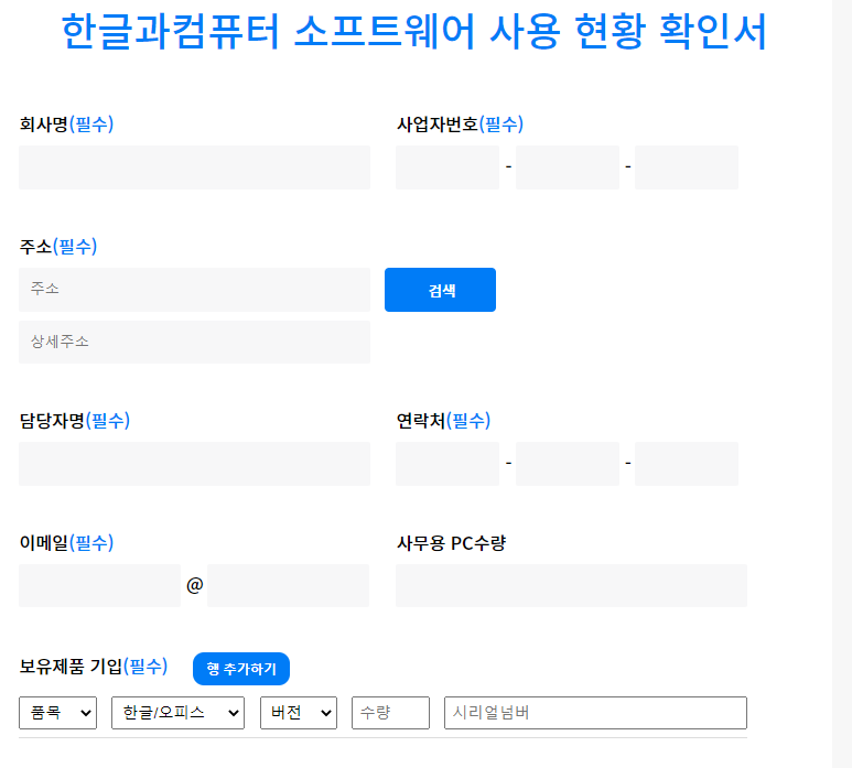 아래의 링크를 통해 사용하고 계신 한글과컴퓨터 소프트웨어 제품에 대한 "사용현황 확인서"를 작성하실 수 있습니다.