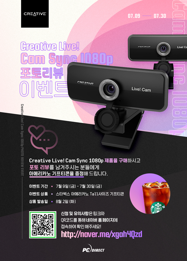 글로벌 사운드 및 컴퓨터 주변장치 제조사 CREATIVE Technology(이하 CREATIVE)의 한국 공식 유통사 피씨디렉트에서 CREATIVE LIVE! CAM SYNC 1080P 웹캠 제품 대상으로 포토리뷰 이벤트를 실시한다고 밝혔다.
