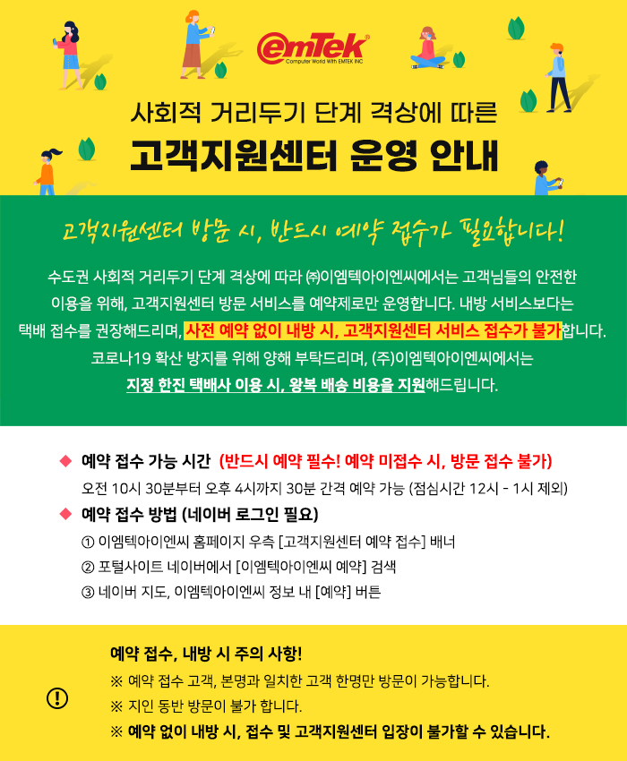 국내 PC 그래픽카드 점유율 1위이자, 대한민국 토종 그래픽카드 브랜드인 (주)이엠텍아이엔씨(대표:이덕수, 이하 이엠텍)는 수도권 사회적 거리두기 단계 격상에 따라 2020년 12월 17일부터 진행되었던, 고객지원센터 내방 접수, 사전 예약제 및 왕복 택배 비용 지원 서비스를 사회적 거리두기 단계 조정까지 연장 진행한다고 밝혔다.