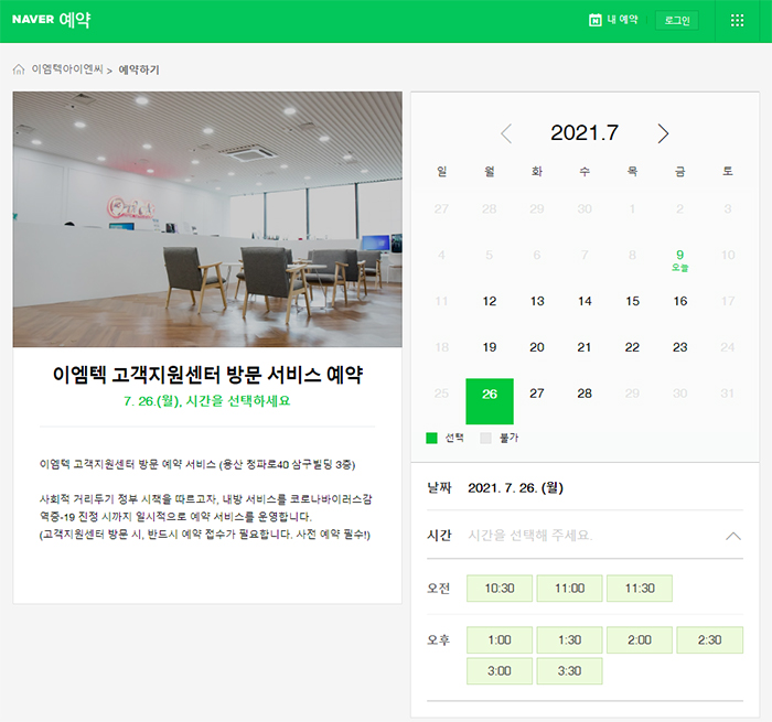이엠텍아이엔씨 고객지원센터 방문 사전 예약은 포털사이트 ‘네이버 예약’을 통해 가능하다.