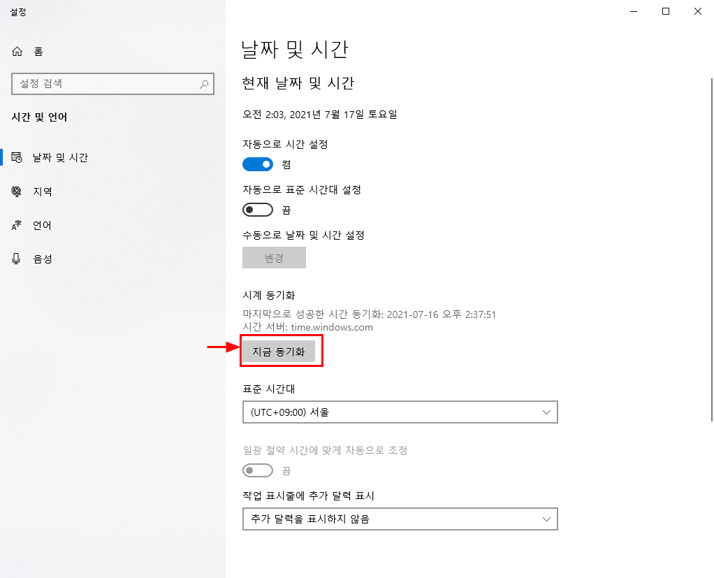 2. [지금 동기화]를 클릭하면 시간 동기화가 이루어진다.