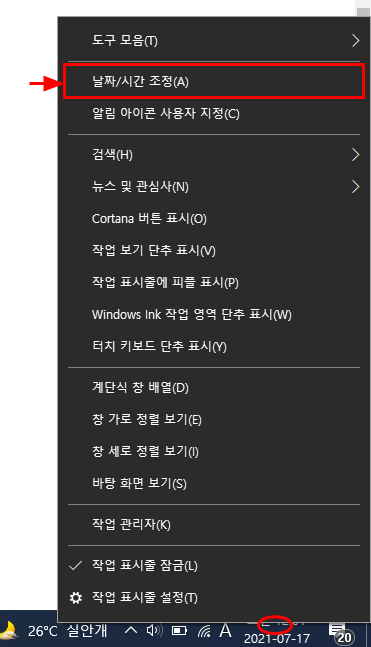 1. 오른쪽 하단 날짜/시간 표시줄에 오른쪽 마우스 클릭 >> 날짜/시간 조정을 클릭한다.