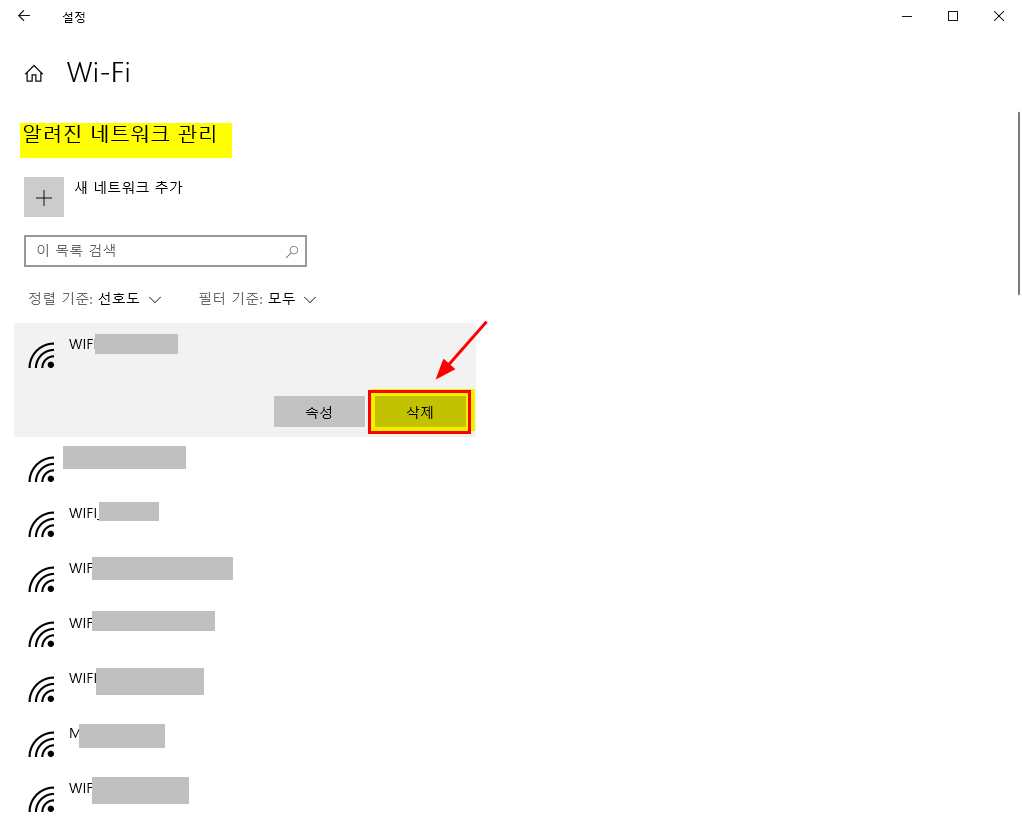만약 와이파이 비밀번호를 변경하였거나, 같은 와이파이명을 쓰고 있어서 접속이 안 될 경우 아래와 같이 와이파이 신호를 삭제해 주면 다시 비밀번호를 입력할 수 있다.