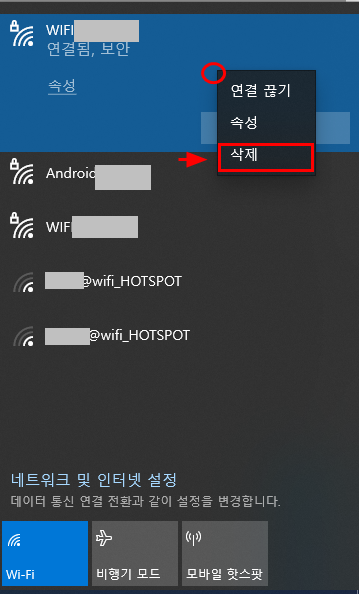 그래서 비밀번호가 변경된 또는 와이파이 비밀번호를 새로 입력하고픈 WIFI 신호를 클릭하면 속성/삭제가 나온다.