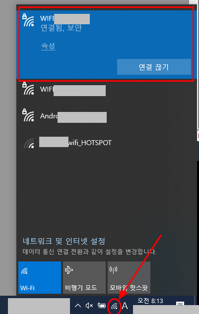 1. 시계표시줄의 와이파이 모양을 찾아 마우스 왼쪽 클릭하면, 연결된 또는 주변의 와아파이 신호들이 뜬다.