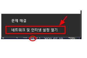 같은 방법이지만 시계표시줄의 와이파이 모양에서 오른쪽 마우스 클릭 >> 네트워크 및 인터넷 설정 열기를 선택한다.