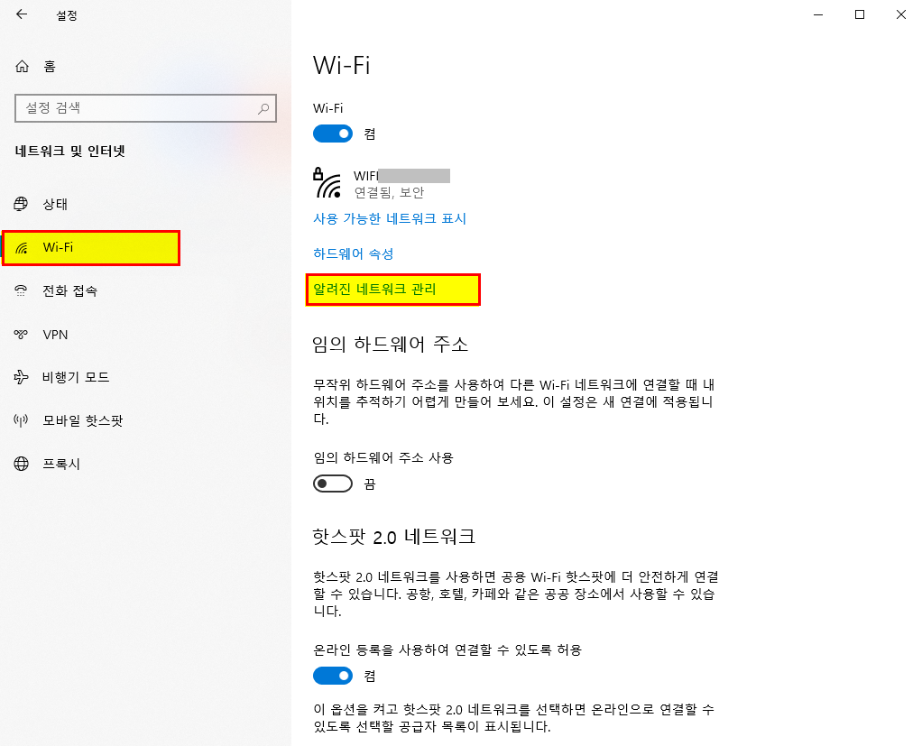 2-2. 왼쪽 메뉴 WIFI >> 알려진 네트워크 관리로 들어간다.