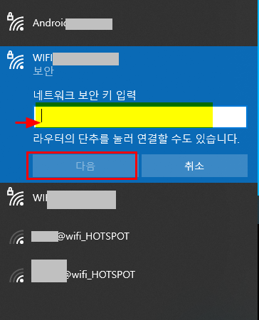 이제 원하는 WIFI 신호의 비밀번호를 다시 입력하면 된다.