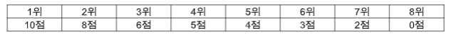4. 각 경기당 등수에 따라 선수 별 점수가 부여되며, 해당 점수를 팀별로 합산하여 해당 팀의 등수가 결정된다.