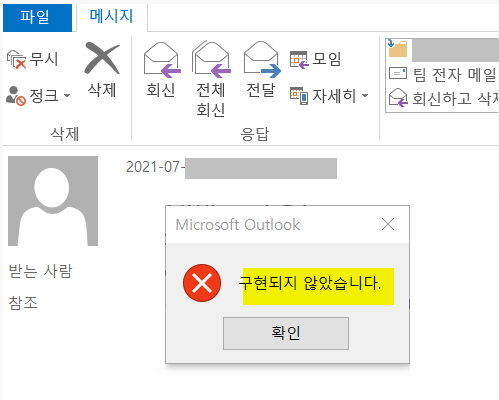 아웃룩 사용시 예상치 않게 구현되지 않았습니다. 메세지와 함께 전체회신 불가할 경우 위와 같은 방법으로 문제를 해결해 보자.