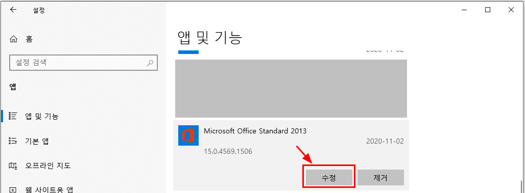 3. MS 오피스를 찾아서 클릭하면 [수정]을 클릭한다.